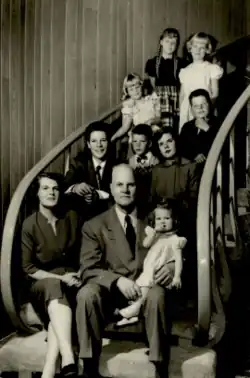 Redd was briefly married to Ethel Moore, who he had met while on business in Moab, Utah, from 1921 until their divorce in 1925.[50] The reason for divorce was cited as "extreme cruelty" in a California newspaper, where Moore was living at the time of divorce.[51] In 1931, Redd married Annaley Naegle, who had been born into a polygamist family in Morelos, Mexico.[52] Naegle's family had moved to Utah following the Mexican Revolution in 1912, and due to anti-polygamy laws the family had not been permitted to live together.[53] Naegle lived with her mother and siblings in Castle Dale, Utah, and Ammon, Idaho before attending Brigham Young University.[54] Following her graduation, Naegle accepted a teaching position in La Sal, and at the same time worked at the La Sal Livestock and Store Company as Redd's secretary.[55][56] Naegle and Redd were married on August 29, 1931, in Farmington, Utah, and were later sealed in the Salt Lake Temple in 1951.[12][57] The couple had nine children, eight of whom lived to adulthood.[58][59]
