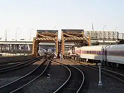 Although rail bridges across the Charles River near the present location of North Station have existed since the Boston and Lowell Railroad opened in 1835, the current bridges date from 1931, when the navigable channel of the Charles River was shifted 300 feet to the north of its former route to allow the platforms at North Station to be extended northwards.[1][2] These bridges were designed by Keller & Harrington of Chicago, Illinois, and built by the Phoenix Bridge Company of Phoenixville, Pennsylvania. Each bridge uses a 629-short-ton (571 t) over-head concrete counterweight. Originally, there were four bridges, but only two of them remain.[1] The bridges were formerly connected to North Station by a wooden trestle; the trestle burned in January 1984, forcing all trains to terminate at a temporary station north of the river for 15 months.[2]