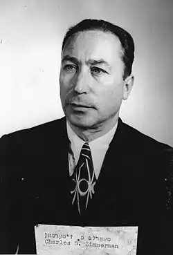 Charles S. Zimmerman was born of Jewish parents as Alexander Ubsushone in 1896. Alexander, known to family and friends as "Sasha," was born in the Ukrainian shtetl of Talne, then part of the Russian Empire.[1] Sasha's father died when he was 7 and his widowed mother opened up a small grocery store and candy shop to support Sasha, his two siblings, and her mother.[2] Sasha was raised in large measure by his grandmother, an Orthodox Jew.[1]