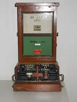 In this block instrument, a disc, instead of a telegraph needle, oscillated between a pair of electromagnets to indicate "line clear" or "train on line" in a window at the bottom of the instrument's face. The indication "line blocked", the default position for block instruments, was displayed through one half of each of the other two indications being displayed in the window. Each indication was obtained by pressing on a key which was held down by a wire frame passing over the key shank (see illustration).[13] This type of instrument survived in use beyond the end of the GWR in 1948, and into the 21st century. The final operational Network Rail example, located in Banbury South signal box was finally decommissioned at 02:00 on 30 July 2016 shortly before the box's demolition.[14][15][16]