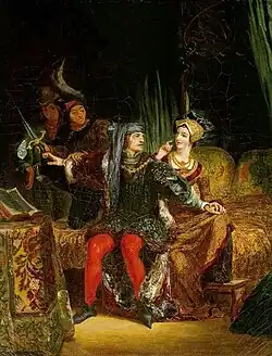 The opera centres on King Charles VI of France, who amid episodes of madness, is attempting to defeat the English invaders. The final scene takes place in the Abbey of Saint-Denis. Odette, a fictional predecessor of Joan of Arc, thwarts a plot by Queen Isabelle and the English nobleman Bedfort to displace the Dauphin with Bedfort's son Lancastre, and helps restore the Dauphin to his rightful place as heir to the throne of France.[7] The King is dying as he and the assembled French swear to the Dauphin: Guerre aux tyrans! jamais en France, Jamais l'Anglais ne régnera ("War on the tyrants! never in France, Never shall the English reign").[8][9]