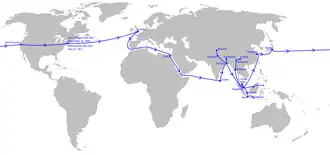 After crossing the Atlantic Ocean on the RMS Lusitania to London, where they gathered the supplies they would need for their expedition, Beebe and his team traveled across the Mediterranean Sea to Egypt, through the Suez Canal, and across the Indian Ocean to Ceylon, where they began their task of documenting the native wildfowl.[67] From Ceylon they traveled to Calcutta, with the goal of capturing the species of pheasants which live only in the Himalayas.[68] By this point Beebe was beginning to conflict with Horsfall, who was unaccustomed to such expeditions.[69] After Beebe had finished his documentation in the eastern part of the range, Horsfall refused to accompany Beebe in the western part of the range, causing Beebe to leave him in the town of Jorepokhri and continue his work in the Western Himalayas without him.[70] Horsfall rejoined them in Calcutta, from which they sailed to Indonesia.[71] The next ship took them to Singapore, where Beebe established a base of operations for the next stage of his expedition.[72]