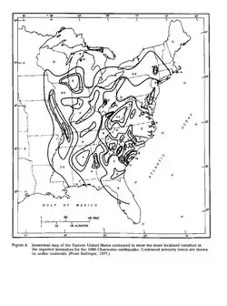 Isoseismal map of the Eastern United States contoured to show the more localized variation' in the reported intensities for the 1886 Charleston earthquake. Contoured intensity levels are shown by Arabic numerals[14]