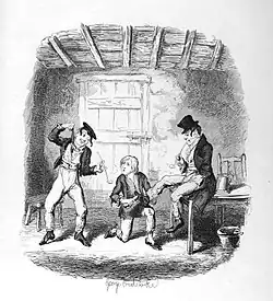 ![]() Charley (centre) and the Dodger steal Mr Brownlow's handkerchief at the bookstall. Illustration by George Cruikshank. | |