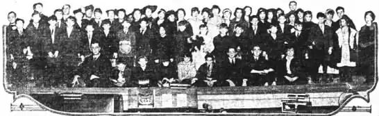 In 1914 they would again set a torrid pace, performing 50 weeks, including two tours of 26 and 19 weeks. They again toured twice in 1915, but this time only for 17 weeks from January through April, and then for the final 6 weeks of the year.[5] In between, Foy appeared in another film in the Mack Sennett short, A Favorite Fool, this time along with the rest of his family.[7] It would be another 13 years before the act again appeared on film, minus their father, in the Vitaphone short, "Chips of the Old Block".[8] This short, in the UCLA archive, is the only surviving film of the performances of the family act.[9] They remained busy during 1916–17, going out on four more tours. 1918 saw them once again on road, touring four cities in seven weeks, starting on New Year's Day.[5] After this tour, the oldest son, Bryan, went to serve in the U.S. Army in World War I.[4] The act would continue without Bryan, as "Eddie Foy and the Younger Foys", through 1923, when their father retired.[5] The Younger Foys continued on the vaudeville stage through the 1920s, eventually disbanding when Eddie Foy Jr. went out on his own as a single act in 1929.[3]