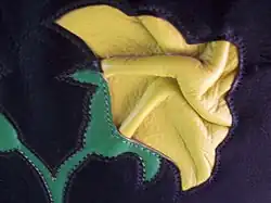 Almost any design imaginable appears on a Charlie boot—oil derricks, animals, names, initials, logos, scenes, just about everything was sketched and worked into the upper and, less frequently, the lower foot. Charlie's signature design, dating to the pair he built "on spec" that Ernest Tubb bought, was the inlaid rose. It began, as did all of his creations, with a detailed sketch. He liked to work from life, so he used actual roses to inspire his design, and Charlie's immense artistic skill allowed the design to bloom. Drawing an intricate rose the size of a quarter is one thing; figuring how to create it out of leather, in-lay it in proportion on the boot, was quite another. So difficult and unique was this design, Charlie kept the process secret for decades, until he passed along the secrets to Miller.[49]