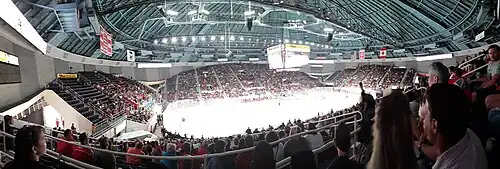 The AHL Checkers' first home game was October 15, 2010, at the Time Warner Cable Arena in front of 12,512 spectators, which set an attendance record for a hockey game in Charlotte.[4] On February 26, 2011, the attendance record was broken as 12,933 fans watched the Checkers defeat the Connecticut Whale 1–0.[5] Almost a year later, on February 25, 2012, the attendance record was broken yet again as 13,102 fans watched the Checkers fall to the Oklahoma City Barons, 3–2.[6] On April 11, 2015, the attendance record was broken a third time as 13,219 fans watched the last Checkers game at Time Warner Cable Arena, a 2–0 loss to the Rockford IceHogs.[7]