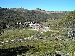 Skiing in Australia had begun some six decades earlier at Kiandra in the Northern Snowy Mountains, but the first Kosciuszko Chalet built at Charlotte Pass in 1930 gave relatively comfortable access to Australia's highest terrain.[11] At 1760m, Charlotte Pass has the highest village base elevation of any Australia ski resort and can only be accessed via over-snow transport in winter.[12] The growing number of ski enthusiasts heading to Charlotte Pass led to the establishment of a cafe at Smiggin Holes around 1939, where horse-drawn sleighs would deliver skiers to the start of the arduous ski to the Kosciuszko Chalet.[13] It was the construction of the vast Snowy Mountains Hydro-Electric Scheme from 1949 that really opened up the Snowy Mountains for large scale development of a ski industry and led to the establishment of nearby Thredbo and Perisher as leading Australian resorts.[14][15] Kosciusko Alpine Club was the first ski club to build its own lodge here in 1952, having occupied the Chalet earlier. Other club lodges were built soon after.