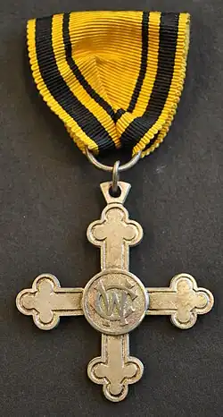 | Description | Silvered white metal cross botonny with a central medallion, bearing on the front the entwined initials C and W (for Charlotte and Wilhelm) and on the reverse the year 1916. |