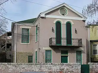 Built with a mix of stone and brick on a stone foundation,[3] the Wallace House was constructed in a distinctive French Provincial style of architecture. Its unusual architecture mixes plain, unadorned elements with certain Romantic elements that is common in French Provincial buildings in the United States. In 1849, the house was converted into a rectory for the newly founded St. Francis de Sales Catholic Church. Given its new role, the house became a leading part of the Catholic Church's presence in the neighborhood. With the construction of the new church building on an adjacent lot in 1851, the parish priest moved into the house, and it was also used as the parish school in its earliest years. Additionally, the house may have served a more surreptitious purpose: local legend holds that a room in the rear of the basement was employed as a station on the Underground Railroad.[2]