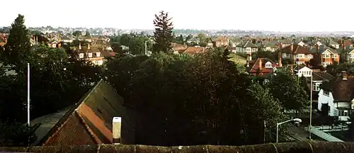 A fresh spate of housebuilding took place north of Alma Road and Richmond Park Road in the 1920s, resulting (amongst other things) in the provision of Charminster Library, designed by F. P. Dolamore and opened in 1932.[11] A further development in this area was the relocation in 1939-40 of the town grammar school, Bournemouth School, from its original premises in Portchester Road to a larger site along the newly-cut East Way. This was the result of a petition presented to Bournemouth Borough Council, owners of the latter site, by a group of the school's alumni.[12] An attendee of the school around this time was the future actor Charles Gray, who grew up in Howard Road.[13] Another school, a secondary modern, was added on the south side of East Way in the post-war period to meet the needs of the expanding populace. This was Summerbee School, designed by the borough architect John Burton and named after Alderman Frank Summerbee, who sat on the town's education committee; it was opened by Cllr. Harry Mears in September 1953.[14] The school was later renamed The Bishop of Winchester School and was reopened in 2010 as The Bishop of Winchester Academy.[15]