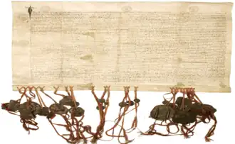 The Charter of Kortenberg (Dutch: Keure van Kortenberg) is an agreement signed and sealed on September 27, 1312, in the abbey of Kortenberg by John II, Duke of Brabant and representatives of the cities of Brussels, Antwerp, 's-Hertogenbosch, Tienen and Zoutleeuw. Creation of the document is of historical and political importance because it retains agreements between inhabitants of a territory with a ruler who had absolute power. This reflected the start of a current that would later be labeled by historians as Brabant's Constitutionalism because residents without control had claimed rights and powers, and had them recorded in writing, which are somewhat comparable to what have come to be called civil and political rights centuries later. In this process, the first simple rules were created for what would develop into a legal order that is now called democratic rule of law.