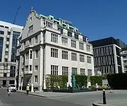 The Insurance Hall is a Grade-II listed building in a Tudorbethan style with stained glass windows bearing the names and emblems of insurance companies that subscribed to the CII and finished internally with wood paneling.[13] The building initially contained a 480-seat conference hall, a council chamber, a library, a museum, a common-room and writing room for members, 4 classrooms and offices occupied by the CII staff, the Insurance Institute of London, the Life Office's Association, the Insurance Charities, and the Insurance Official's Society.