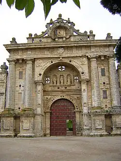 At the entrance of the enclosure stands a wide tetrastyle portico with a semicircular central span which holds, in a smaller span, two heavy sheets of wood studded with bronze. This work, begun in 1571 by Jerezan architect Andrés de Ribera, conforms to the purest canons of Andalusian classicism. Conceived as a great triumphal arch, it is composed in a sober manner and decorated with coats of arms, canopies, fretwork windows, and glazed ceramic hemispheres, constituting a superb example of Renaissance architecture.