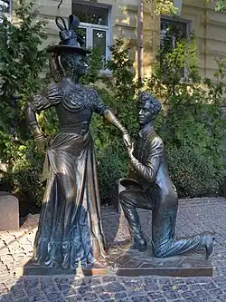 That evening, Svyryd takes Pronya to the movies on a date and afterwards makes a false confession of love to her. She invites him to her house to propose. Later that night, while drinking with his friends, Svyryd boasts about his successful date with Pronya; and that once he gets the money, he will start an affair with a beauty. Svyryd meets Halya in an alley, falsely confesses his love to her, claims to be a rich suitor, and forces her into an embrace. Halya's mother, Sekleta Lymerykha (Nonna Koperzhynska), happens by and stops it. Sekleta threatens him and makes him swear on the steps of Saint Andrew's Church to marry Halya whose heart actually belongs to Stepan.