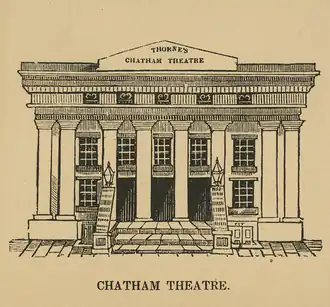 The Chatham Garden Theatre or Chatham Theatre was a playhouse in the Chatham Gardens of New York City. It was located on the north side of Chatham Street on Park Row between Pearl and Duane streets in lower Manhattan. The grounds ran through to Augustus Street. The Chatham Garden Theatre was the first major competition to the high-class Park Theatre, though in its later years it sank to the bottom of New York's stratified theatrical order, below even the Bowery Theatre.