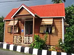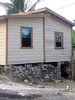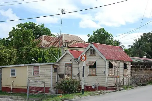 Chattel house is a Barbadian term for a small moveable wooden house that working class people would occupy. The term goes back to the plantation days when the home owners would buy houses designed to move from one property to another. The word "chattel" means movable property so the name was appropriate.[1] Chattel houses are set on blocks or a groundsill rather than being anchored into the ground. In addition, they are built entirely out of wood and assembled without nails. This allowed them to be disassembled (along with the blocks) and moved from place to place. This system was necessary historically because home "owners" typically did not own the land that their house was set on. Instead, their employer often owned the land. In case of a landlord tenant (or employer/employee) dispute, the house could be quickly moved to a new property.[2]