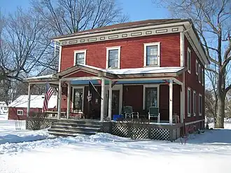 The Chauncey Ellwood House is designed in Italianate style, today, painted a distinctive red color. A large pond occupies the backyard[1] and the Esther Mae Nesbitt House lies adjacent; to the northwest of the house. The house bears a full-length front porch supported by four bracketed wooden columns.[3] On the front wall of the Chauncey Ellwood House two additional wooden supports are anchored at either end of the porch. A small triangular pediment overhangs the front stairs.[3] The current front porch is not an original. Photographs taken between 1971 and 1975 show that the original porch stretched not only the entire length of the front facade but continued around the house the full length of the north face.[4] In the older set up the stairs were set at the far south end of the house instead of centered, as they are today.[4]