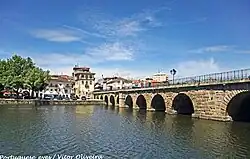 Artefacts discovered in the region of Chaves identify the earliest settlement of humans dating back to the Paleolithic.[4] Remnants discovered in Mairos, Pastoria and São Lourenço, those associated with transient proto-historic settlements and castros, show a human presence in the Alto Tâmega dating to the Chalcolithic.[4] The region has seen persistent human settlement since Roman legions conquered and occupied the fertile valley of the Tâmega River, constructing a nascent outpost and taking over the existing castros in the area. The settlement was located at the convergence of three important Roman roads: the Bracara Augusta, Asturica, and Lamecum that crossed the Roman Province of Gallaecia, linking Rome to the region's natural resources.[4] It was a military centre known for its baths, which lasted until the 16th century. This civilization constructed protective walls to protect the local population; spanned the river with the bridge;[5] promoted the baths (with its warm medicinal waters); exploited local mines and alluvial deposits and other natural resources. Its importance led to the urban nucleus being elevated to the status of municipality in 79 AD, during the reign of the first Flavian Caesar, Titus Flavius Caesar Vespasianus Augustus.[4] Its benefactor consequently influenced its toponymy, becoming known as Aquae Flaviae. Artefacts from the area around the Matriz church indicate that Aquae Flaviae's centre was located in this place, in addition to an ancient headstone showing gladiatorial combat.[4][6]