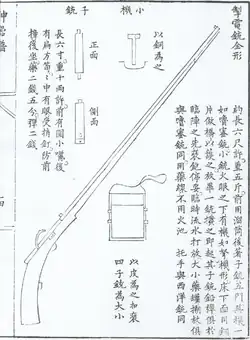 The che dian chong (simplified Chinese: 掣电铳; traditional Chinese: 掣電銃; lit. 'lightning quick firearm') is a breech-loading, cartridge-using musket invented by Zhao Shizhen (趙士禎) during the Ming dynasty for the dynasty's arsenals.[1] Like all early breech loading fireams, gas leakage was a limitation and danger present in the weapon's mechanism.[2]