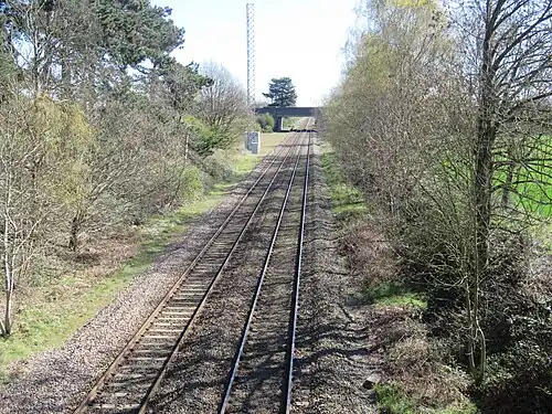 The bridge spanned the two running tracks and the southern siding, with the signal box now located to the east of the road. The northern sidings were cut back, and the trailing connection to the eastbound track was removed.[12] The level crossing continued to be used by local traffic for several years afterwards.[13] The goods station closed in 1963, and most of the infrastructure was subsequently removed, although a loading gauge was still evident to the north of the tracks in 1992[14] and 2021, and the site of the level crossing gate is now occupied by the equipment room for a hot axle box detector.[1]