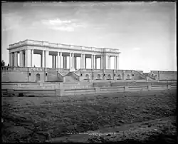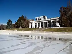 The Cheesman Memorial was constructed in 1908 from Colorado Yule marble, in the Neoclassical style, on a raised platform with retaining walls clad in ashlar masonry and topped by decorative balustrades. The walls were installed with fountains and inset with grand staircases approaching the pavilion, in the style of an Italian Renaissance garden.[8]: 44–45 At the base of the supporting platform to the west are three large reflecting pools, used as wading pools in the summertime until the 1970s. Between 1934 and 1972 the Denver Post sponsored open air performances of Broadway musicals and operas staged at the pavilion.[9] The famed Olmsted Brothers designed the landscaping surrounding the memorial; in 1912 an esplanade with formal parterres for flower plantings was installed between the memorial and Williams Street parkway to the east.[10]
