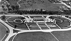 By the 1970s the pavilion and supporting plinth were in a state of serious disrepair. City authorities undertook a restoration of the pavilion but decided to replace the platform altogether with gently sloping lawns and modest concrete staircases. Today only the pavilion and reflecting pools remain of the original complex.[11] The new grading meant that much of the original formal landscaping was lost during this period, replaced with simplified flower beds and a rose garden to the north.[12]