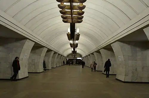 Chekhovskaya (Russian: Чеховская) is a station of the Serpukhovsko-Timiryazevskaya Line of the Moscow Metro. It was opened on December 31, 1987, and served as the northern terminus of the line for the following year. Its depth is 62 metres (203 ft). The vestibule is located in Pushkinskaya Square, while the station is named for the writer Anton Chekhov. It was the deepest station in Moscow Metro from 1987 until 1991.