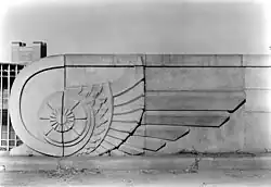 Located in the play area integrated with its sprinklers are two limestone sculptures of cattle heads.[10][18][45] The sculptures were originally architectural features of the New York Butchers' Dressed Meat Company building,[45][46] a Neo-Renaissance-style slaughterhouse in Hell's Kitchen.[47] The building was demolished in 1991, after which the sculptures were preserved by the New York City Landmarks Preservation Commission.[10][46][48]: 12 The two cow sculptures along with two sculptures of ram's heads, were purchased by the Hudson River Park Trust at auction in 2012.[45][46] The cattle sculptures were added to the park during the 2018 renovations[10][18][45] (the ram sculptures were given to DeWitt Clinton Park in Hell's Kitchen).[46]