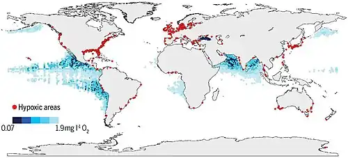 - ^ Breitburg, Denise; Levin, Lisa A.; Oschlies, Andreas; Grégoire, Marilaure; Chavez, Francisco P.; Conley, Daniel J.; Garçon, Véronique; Gilbert, Denis; Gutiérrez, Dimitri; Isensee, Kirsten; Jacinto, Gil S.; Limburg, Karin E.; Montes, Ivonne; Naqvi, S. W. A.; Pitcher, Grant C.; Rabalais, Nancy N.; Roman, Michael R.; Rose, Kenneth A.; Seibel, Brad A.; Telszewski, Maciej; Yasuhara, Moriaki; Zhang, Jing (2018). "Declining oxygen in the global ocean and coastal waters". Science. 359 (6371): eaam7240. Bibcode:2018Sci...359M7240B. doi:10.1126/science.aam7240. PMID 29301986. S2CID 206657115.