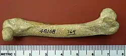 Chendytes lawi is an extinct, goose-sized flightless marine duck, once common on the California coast, the California Channel Islands, and possibly southern Oregon. It lived in the Pleistocene and survived into the Holocene. It appears to have gone extinct at about 450–250 BCE.[3] The youngest direct radiocarbon date from a Chendytes bone fragment dates to 770–400 BCE and was found in an archeological site in Ventura County. Its remains have been found in fossil deposits and in early coastal archeological sites. Archeological data from coastal California show a record of human exploitation of Chendytes lawi for at least 8,000 years.[3] It was probably driven to extinction by hunting, animal predation, and loss of habitat. Chendytes bones have been identified in archaeological assemblages from 14 coastal sites, including two on San Miguel Island and 12 in mainland localities.[3] Hundreds of Chendytes bones and egg shells found in Pleistocene deposits on San Miguel Island have been interpreted as evidence that some of these island fossil localities were nesting colonies, one of which Guthrie dated to about 12,000 14C years (about 13,500–13,000 calibrated years B.P.).[3] There is nothing in the North American archaeological record indicating a span of exploitation for any megafaunal genus remotely as long as that of Chendytes.[3]