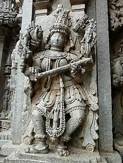 The south shrine entrance has two dvarapalas: Bhadra and Subhadra. The lintel above the entrance shows Venugopala. A 13th century Lakshminarayana carving is shown seated in the Sukhasana yoga pose, with him are chakra, conch, lotus and a gada (mace). Past the Sukhanasi, are Jaya and Vijaya, while the lintel shows a seated Vishnu and the canopy shows a dancing Vishnu.[40] The south garbha griya is 8'x8' feet square, but includes niches into the wall for more space. The image of Krishna in the sanctum is 4.5 feet high. He wears ear rings, necklaces, armlets, bracelets, finger rings, toe rings, anklets, girdle and jewelled diadem.[40] His legs are crossed, head slightly bent as he plays the bansuri (flute) he holds with both his hands. His fingers are in a tapping position, and all beings - from humans to cows, gods to goddesses inside the sanctum are depicted as absorbed in the divine music. Some figures are shown running to listen to the music, their clothes slipping off. Above the householders, gopis and cows are shown rishis (sages) who too are lost in the experience.[40]