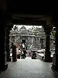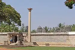 The Keshava temple at Somanathapura faces east and is enclosed in a walled courtyard with a major gate (mahadvara).[20] Outside the walls before the gate stands a tall pillar, which once had a Garuda statue on top, now missing. Inside the gate, to the left are vertical standing inscription stones. These stones have the form of the hero stones, with the top decorated with Hindu iconography as well as miniature reliefs of Keshava, Janardhana and Venugopala. The inscription is in old Kannada. The small entrance mandapa is supported by lathe-carved soapstone pillars.[4][20] The temple is carved from soapstone, a green-grey chloritic schist material that is soft in quarry but hardens when exposed to air. This is not locally available and must have been imported from another part of South India. It enabled the artists to shape and carve out intricate details for the artwork.[21][22]