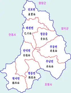 | Jinbo-myeon | 진보면 | 眞寶面 |