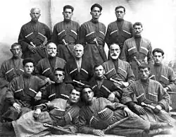 A chokha,[a] also known as a cherkeska,[2] is a woolen coat with a high neck that is part of the traditional male dress of peoples of the Caucasus.[3] It was in wide use among Avars, Eastern Armenians,[4] Abazins, Abkhazians, Azerbaijanis, Balkars, Chechens, Circassians, Georgians, Ingush, Karachays, Kumyks, Nogais, Ossetians, Tats, the peoples of Dagestan, as well as Terek and Kuban Cossacks from the Russian Empire, who adopted it from the aforementioned peoples.[4]