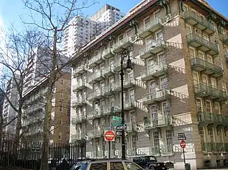 The complex comprises four buildings: 508–514 East 78th Street to the northwest, 516–522 East 78th Street to the northeast, 517–523 East 77th Street to the southeast, and 507–515 East 77th Street to the southwest. A driveway runs west–east between the northern and southern buildings.[7] There are also recesses separating the eastern and western buildings on either street, which contain driveways that slope down to the basement.[2] The two eastern buildings face Cherokee Place, while the two western buildings face a neighboring school's playground, separated from it by a one-story-high retaining wall.[7] The buildings contain nearly identical facades and are each six stories tall.[8] Each building's entrance connects to a vaulted passage with Guastavino tile ceilings and glazed brick walls, which in turn leads to a courtyard in the middle of each building.[9]