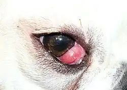 Cherry eye is a disorder of the nictitating membrane (NM), also called the third eyelid, present in the eyes of dogs and cats.[1] Cherry eye is most often seen in young dogs under the age of two.[2] Common misnomers include adenitis, hyperplasia, adenoma of the gland of the third eyelid; however, cherry eye is not caused by hyperplasia, neoplasia, or primary inflammation.[3] In many species, the third eyelid plays an essential role in vision by supplying oxygen and nutrients to the eye via tear production.[4] Normally, the gland can turn inside-out without detachment.[3] Cherry eye results from a defect in the retinaculum which is responsible for anchoring the gland to the periorbita. This defect causes the gland to prolapse and protrude from the eye as a red fleshy mass.[3] Problems arise as sensitive tissue dries out and is subjected to external trauma[3] Exposure of the tissue often results in secondary inflammation, swelling, or infection.[3] If left untreated, this condition can lead to dry eye syndrome and other complications.[4]