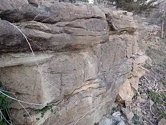 It is typically broken into blocks by vertical joints at near 90 degrees to each other, typically striking roughly NE and NW.[2] Its name location is the village of Block, Kansas (named after John Block, an early settler - the fact the Block Limestone also tends to fracture into neat blocks is something of a coincidence).
