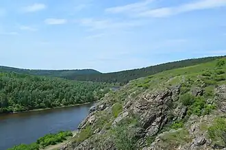 The Chersky Range is part of the South Siberian System. It rises in the central part of the Transbaikal region of Russia, stretching in a northeast/southwest direction for roughly 650 meters (2,130 ft) between the left bank of the Chilka River and the valley of the Delingde River —a right tributary of the Vitim River of the Lena River basin. The Ingoda River breaks through the ridge in its central part, along the valley through which a section of the Trans-Siberian Railway crosses the range.