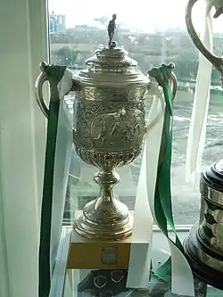 The original Cheshire Football Association Challenge Cup, which was presented to Northwich Victoria in 1885 following their success in the competition for 6 consecutive seasons. The engraving says 'Presented to Northwich Victoria Football Club by the Cheshire Football Association 23 June 1885 As a mark of appreciation for their having won it six seasons in succession'.