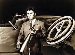 Some of Bonestell's best known depictions of speculative spacecraft include paintings for the Collier's magazine series "Man Will Conquer Space Soon" in 1952, such as a winged rocket reaching orbit,[52] a rotating space station in orbit and a winged rocket with a space telescope being assembled,[53] a Moon exploration fleet being assembled in Earth orbit,[54] and winged landing ships being assembled in orbit above Mars.[55] Later works included a ship for mining asteroids.[56]