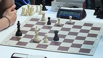 There is no strict criterion for when an endgame begins, and different authors have different opinions.[3] The former World Chess Champion Alexander Alekhine said, "We cannot define when the middle game ends and the endgame starts."[4] Using the standard system for chess piece relative value, Speelman considers that endgames are positions in which each player has thirteen or fewer points in material (not counting the king). Alternatively, they are positions in which the king can be used actively, but there are some famous exceptions to that.[5] Minev characterizes endgames as positions having four or fewer pieces other than kings and pawns.[6] Fine considers endgames to be positions without queens.[3] Flear considers endgames to be positions where both players have at most one piece (other than kings and pawns)[7] whereas Dvoretsky considers them to be positions in which at least one player has such a material configuration.[8] Some problem composers believe that the endgame starts when the player to move can force a win or a draw against any variation of moves.[9]