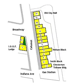 - ^ a b c d e f g h i j k l m n o "Indiana State Historic Architectural and Archaeological Research Database (SHAARD)" (Searchable database). Department of Natural Resources, Division of Historic Preservation and Archaeology. Retrieved June 1, 2016. Note: This includes Jim Morrow and Beverly Overmyer (June 1998). "National Register of Historic Places Inventory Nomination Form: Chesterton Commercial Historic District" (PDF). Retrieved June 1, 2016., site map, and Accompanying photographs.