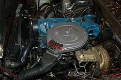 The Vega engine is a 2,287 cc (2.3 L; 139.6 cu in) inline-four with a die-cast aluminum alloy cylinder block, cast-iron cylinder head and single overhead camshaft (SOHC).[33] The block is an open-deck design with siamesed cylinder bores. The outer case walls form the water jacket, sealed off by the head and head gasket, and the block has cast-iron main bearing caps and crankshaft. The cast-iron cylinder head was chosen for low cost. A simple overhead valvetrain has three components activating each valve instead of a typical pushrod system's seven. An external belt from the crankshaft drives the five-bearing camshaft plus the water pump and fan.[34]