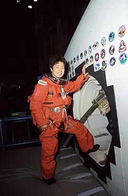 Chiaki Mukai (向井 千秋, Mukai Chiaki; born May 6, 1952) is a Japanese physician and JAXA astronaut.[2] She was the first Japanese woman in space, the first Japanese citizen to have two spaceflights, and the first Asian woman in space.[1] Both were Space Shuttle missions; her first was STS-65 aboard Space Shuttle Columbia in July 1994, which was a Spacelab mission. Her second spaceflight was STS-95 aboard Space Shuttle Discovery in 1998. In total she has spent 23 days in space.