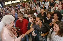 Chiara was invited to speak to a meeting of Italian politicians of various parties. It was 2 May 1996, in Naples. Her proposal to them was that, first of all, they should live fraternity among themselves and then bring this spirit to all their relationships with other politicians of different parties, with the goal that together they might achieve the common good. This gave shape to the Movement of Politics and Policy for Unity (MppU).[40] Chiara outlined its fundamental features on several occasions when she met members of the government in Slovenia, Spain, France, the Czech Republic, Brazil (1998) and Italy (2000).[41]