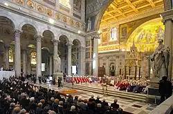 Her funeral was celebrated in Rome, on 18 March, at the Basilica of Saint Paul Outside the Walls. Thousands of people packed the church and overflowed outside where large screens had been set up to allow them to follow the service. Civic leaders as well as prominent figures from the Catholic Church, many other Christian churches and other religions, attended and offered their testimony to her life. An eminent Thai Buddhist monk, Phara-Maha Thongratana, commented: "Now Chiara and her great Ideal are the legacies of the whole of humanity". News of her funeral was reported internationally.[69] Cardinal Tarcisio Bertone, then-Secretary of State of the Vatican, read the letter from Pope Benedict XVI, who said among other things: