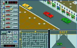 Chicago 90 offers two game modes which in the first mode, the player play as a gangster and the second one as the police.[1] Each two modes had opposing goals and different strategies. In the first mode, the player simply have to escape the city while avoiding being trapped by the police. In the second mode, the player can control six police cars by directly driving any of the six and issuing commands to the other five in an attempt to prevent the gangster from escaping the city.[1] The game has three levels for the each two modes.[2]