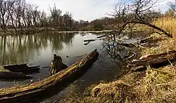The present Des Plaines River is not the river as it was in, for example, 1673 when Jolliet and Marquette first passed through the Chicago Portage. During the period 1892-1900 the original channel of the river was straightened, cutting off the part that the Jolliet and Marquette party used to reach the west end of the portage.[16] This aerial photo shows the Des Plaines River and the area around the Portage Historic Site as they exist presently (2024). The remnants of the old course of the river can be seen as faint collections of water in the middle of the image. The current course of the Des Plaines River flows north to south and is shown just to the left of these remnants.