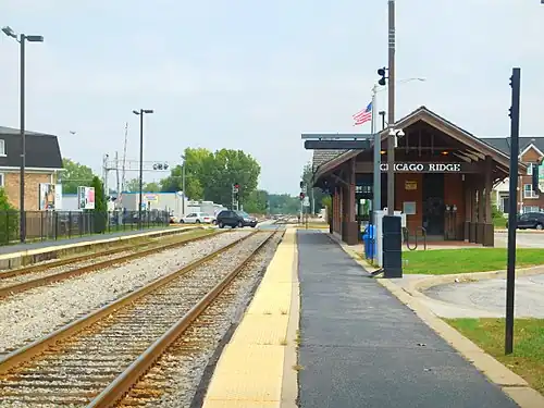 Chicago Ridge is a station on Metra's SouthWest Service in Chicago Ridge, Illinois. The station is 16.6 miles (26.7 km) away from Chicago Union Station, the northern terminus of the line.[2] In Metra's zone-based fare system, Chicago Ridge is in zone 3. As of 2018, Chicago Ridge is the 127th busiest of Metra's 236 non-downtown stations, with an average of 372 weekday boardings.[1]